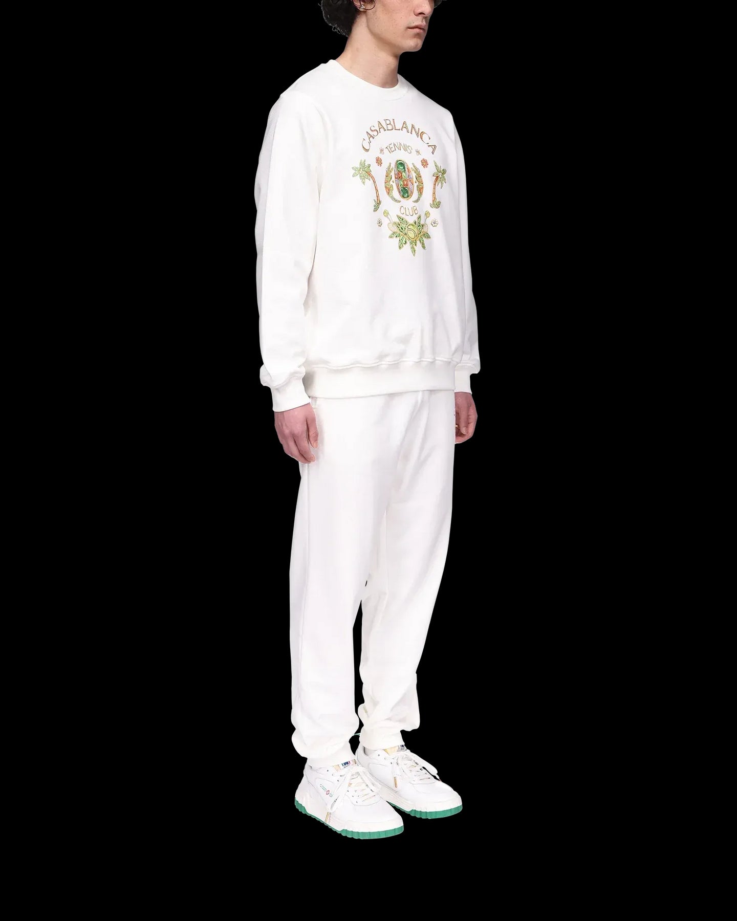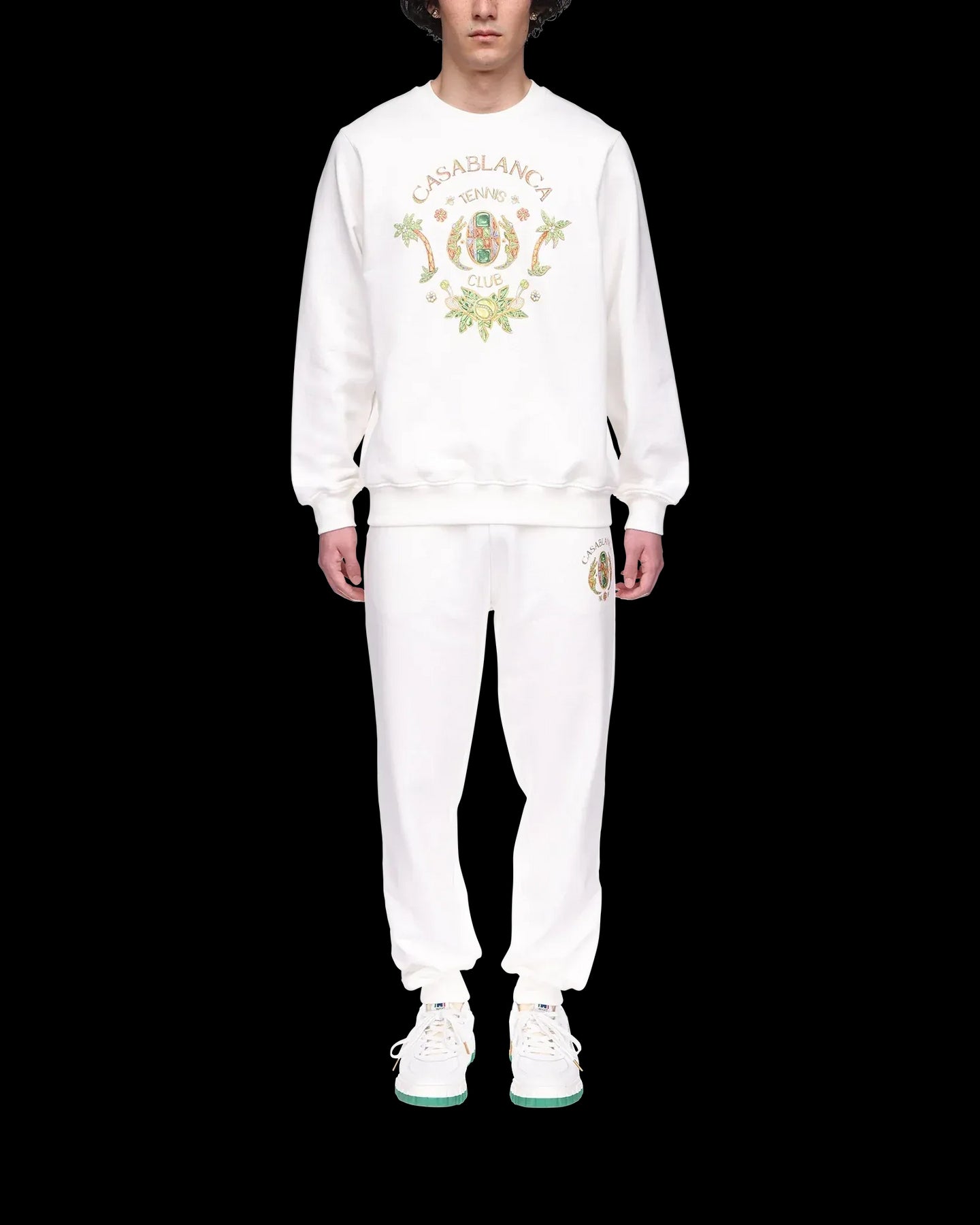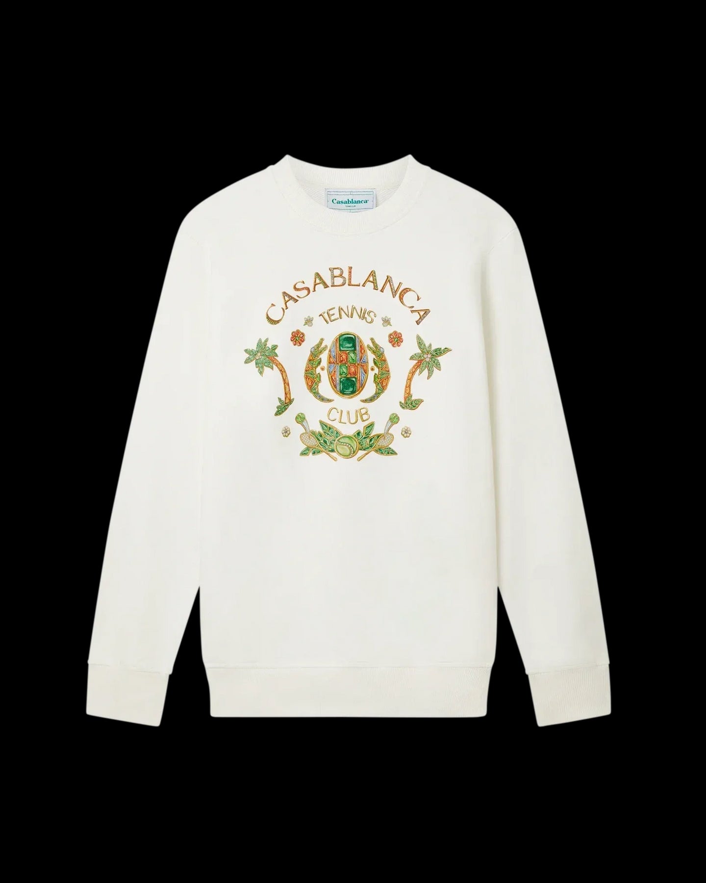 La felpa Joyaux D'Afrique Tennis Club è un modello a maniche lunghe stampato con un'opera d'arte stagionale Casablanca che incorpora riferimenti alla natura nigeriana e ai gioielli della maison. Realizzata in cotone biologico e completata da un classico girocollo e finiture a costine.